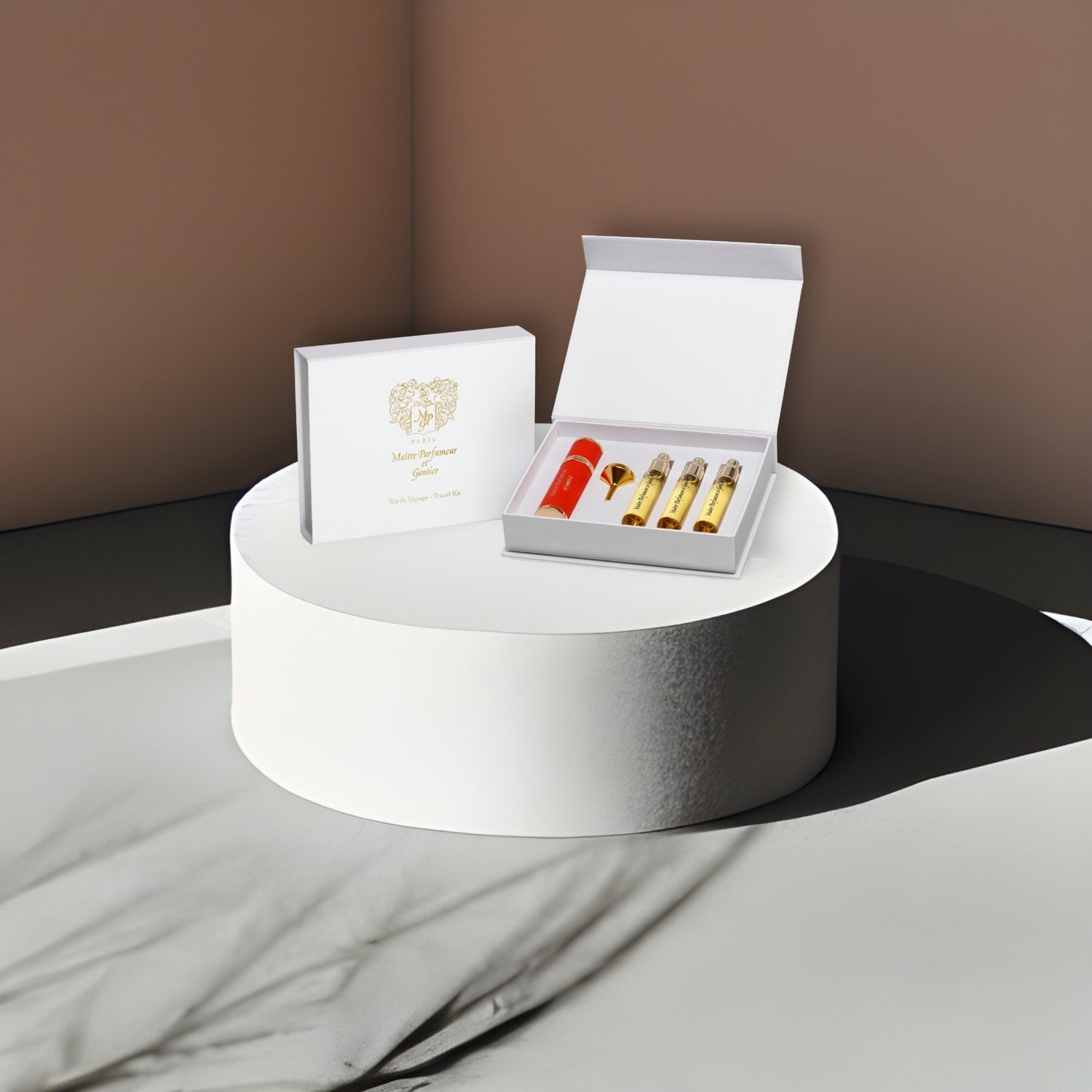 Kit de voyage : Il est composé d’un vaporisateur en zamac habillé de cuir et de trois flacons de 10 ml rechargeables.